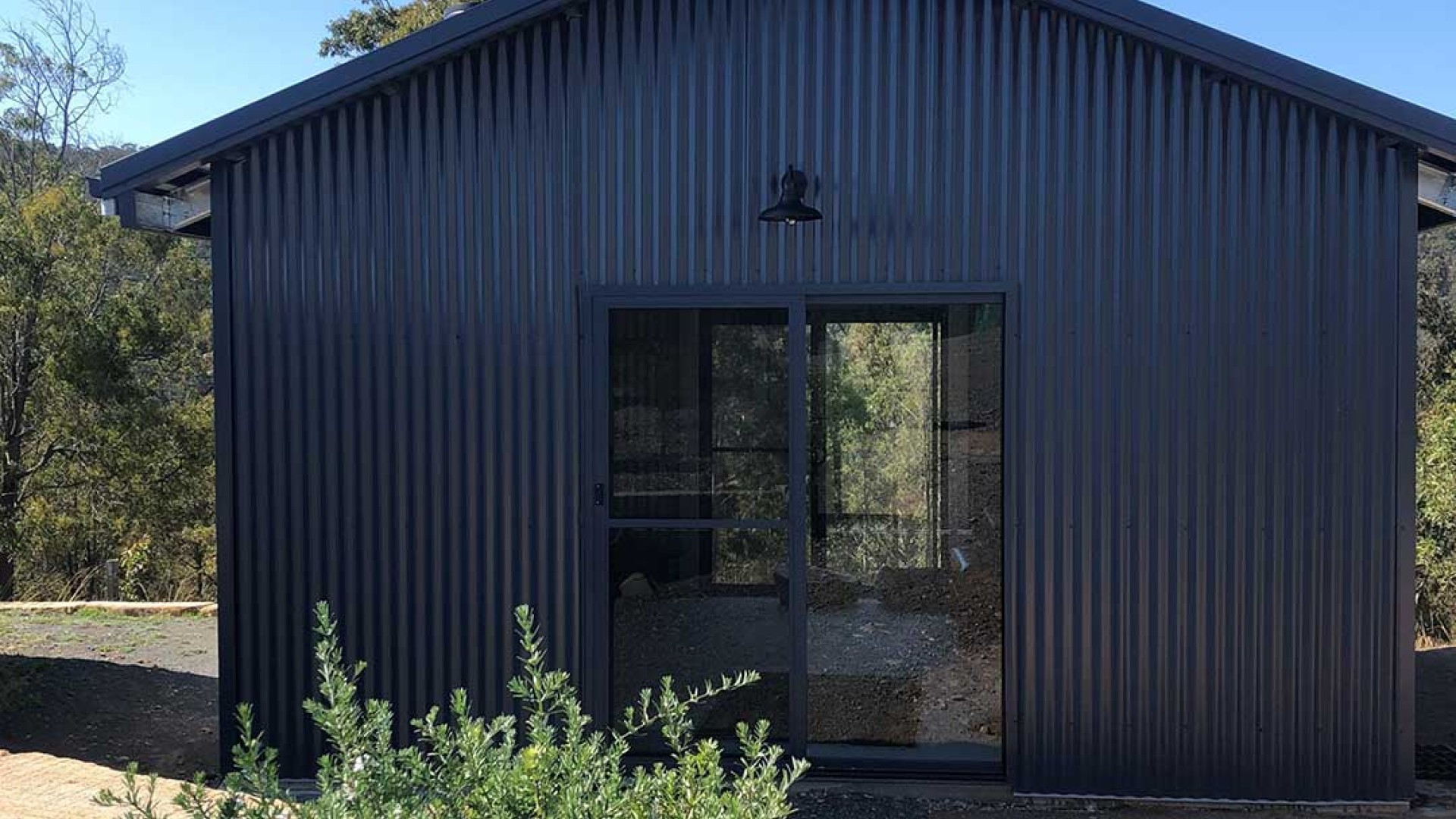 American barn style shed built to serve as storage, garage and also serve as workshop for family while main liveable dwelling was built. Colorbond Monument color all over.