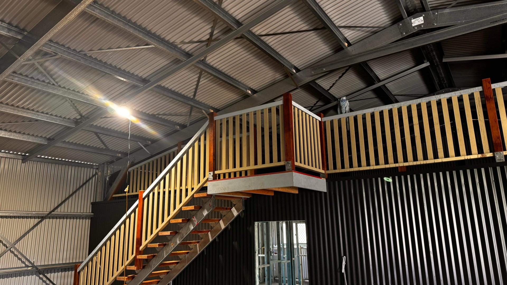 Double size garage with extra height to accommodate storage with a Mezzanine floor and living quarters below. Combination of Colorbond Monument, surfmist and surfmist, monoclad wall cladding, with roller door motors and roof insulation for a bit of comfort.
